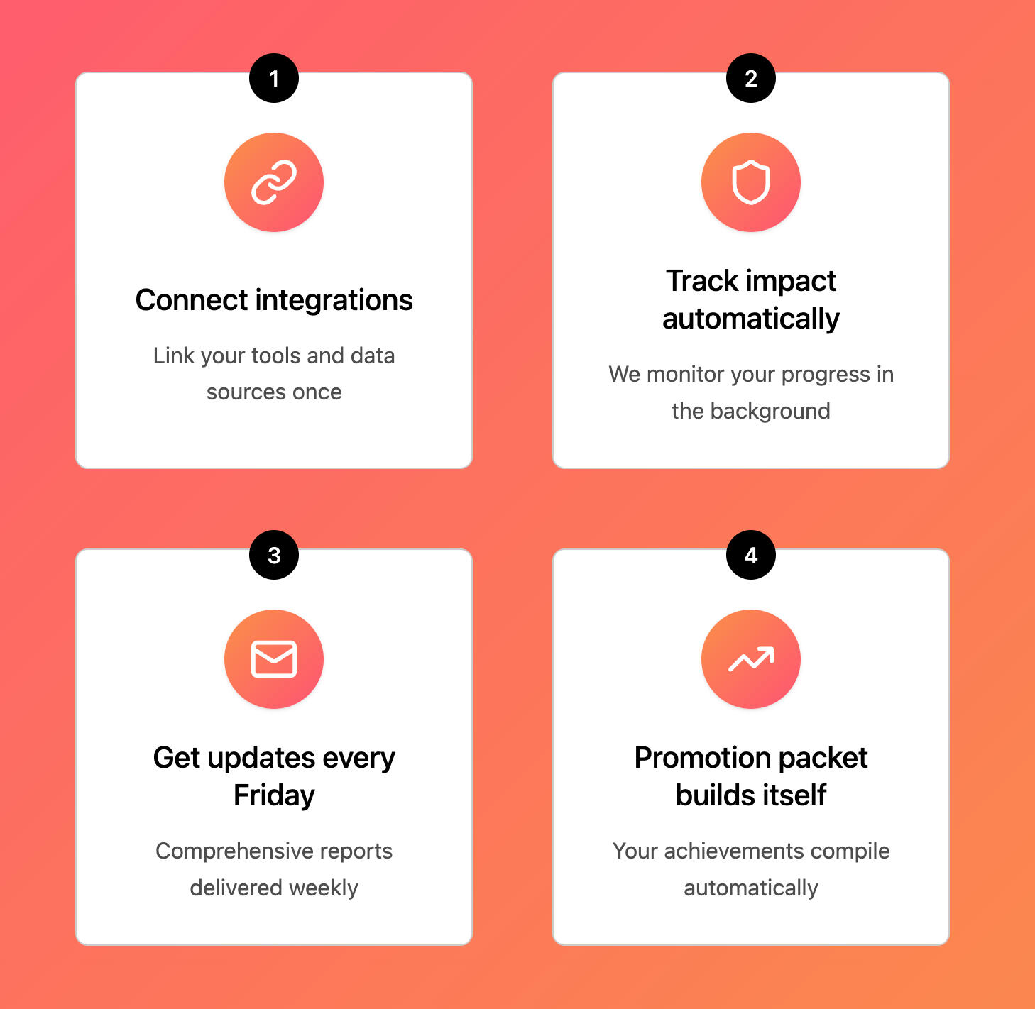 Ship features all year. Scramble for evidence at review time. Meanwhile, peers who document better get promoted faster.